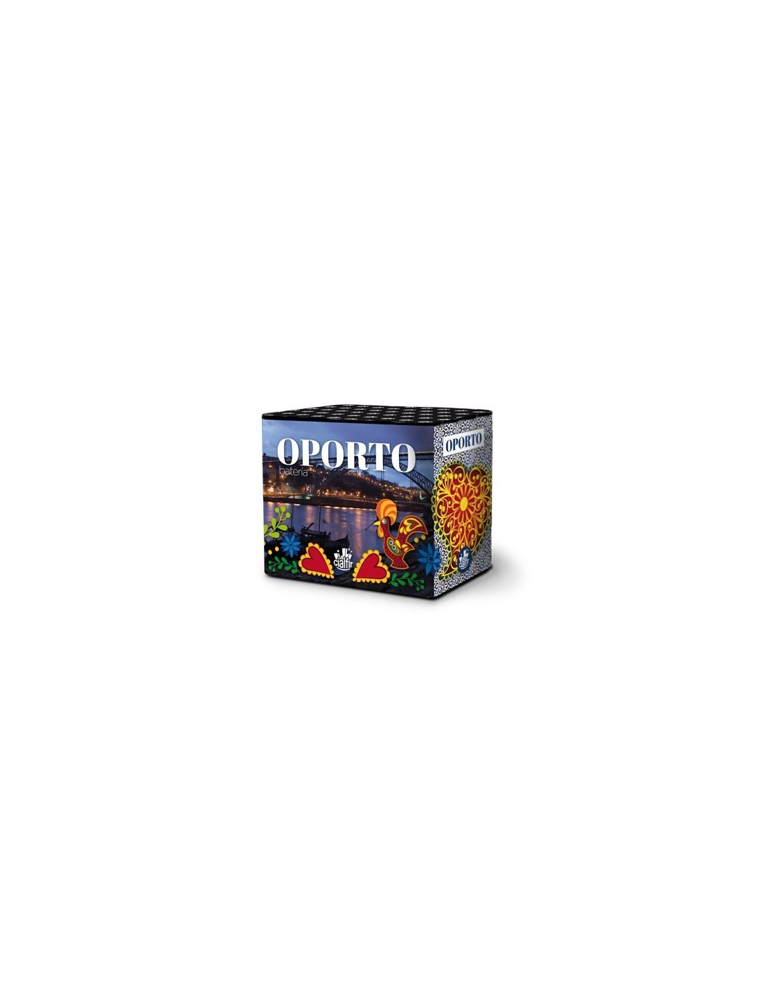 Batería de 24 disparos de colas verdes, rojas y doradas combinadas con perlas multicolor, con coco plateado y final de ola de brocade y centro azul.
